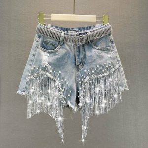 Shorts Tassel Beading High Waist Wide Leg Denim Shorts