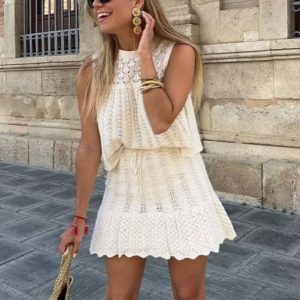 Jacquard mesh-knit top and mini skirt set