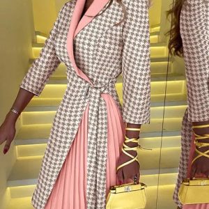 New V Neck Strap Waist Medium Solid Thousand Bird Grid Pleated Dress